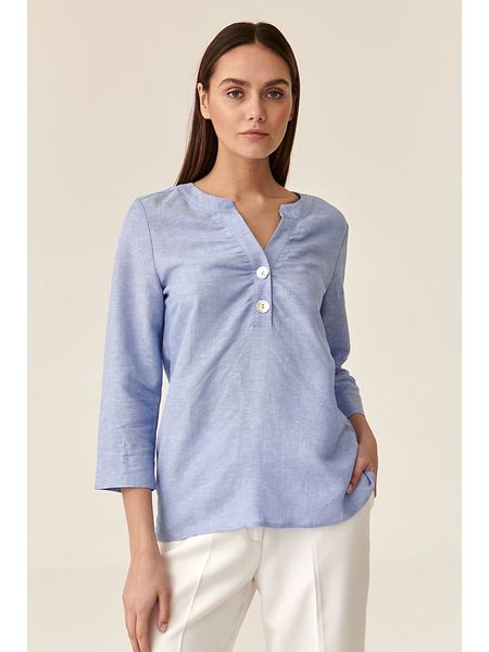 – z dodatkiem lnu- dekolt: z rozcięciem- zapięcie: skrócona listwa guzikowa- długość rękawa: 7/8- krój: prosty- look: jednokolorowy