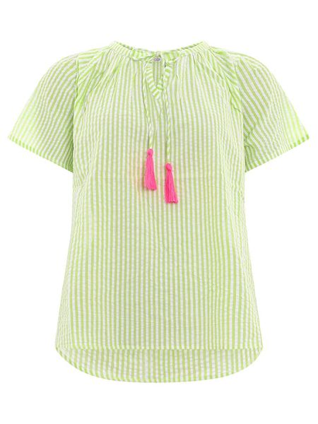 – czysta wiskoza- dekolt: okrągły- detale: ozdobne wiązanie- krój: dłuższe plecy- wzór: paski