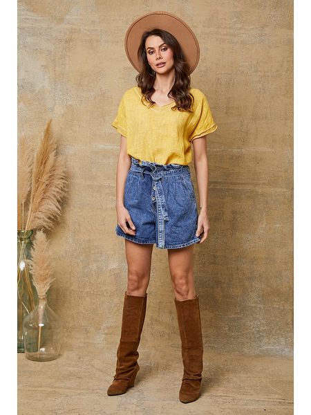 – czysty len- dekolt: V- detale: połyskująca nitka- krój: prosty- look: jednokolorowy