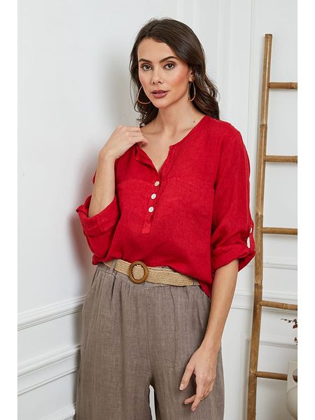 – czysty len- dekolt: z rozcięciem- zapięcie: skrócona listwa guzikowa- zakończenie rękawów: patka i guzik- krój: prosty- look: jednokolorowy