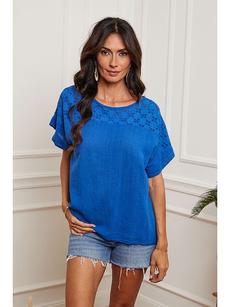 – z dodatkiem lnu- dekolt: okrągły- krój rękawów: motylek – krój: prosty- wzór: dziurkowany