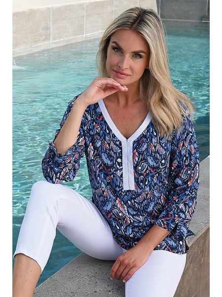 – czysta wiskoza- dekolt: V- długość rękawa: 3/4- krój: prosty- wzór: na całościWskazówka: Na metkach odzieży tej marki znajdują się rozmiary francuskie. Rozmiarówka została przez nas przeliczona. Podane do wyboru warianty rozmiarów odpowiadają standardowym europejskim rozmiarom konfekcji. Prosimy zapoznać się z zamieszczonym objaśnieniem rozmiarów: