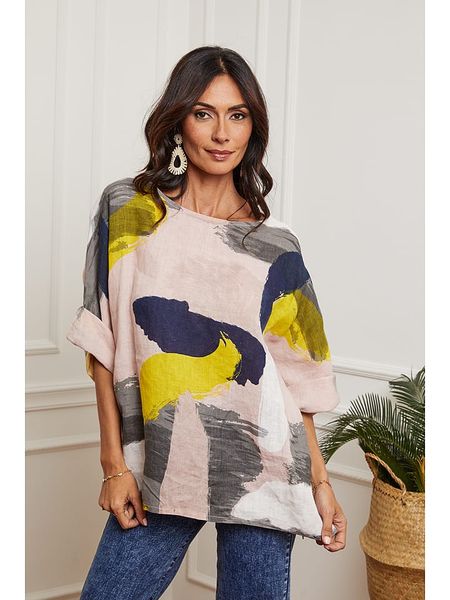– czysty len- dekolt: okrągły- zakończenie rękawa: podwijane- krój: prosty- wzór: na całości