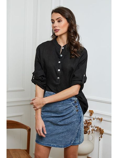 – czysty len- dekolt: okrągły- zapięcie: skrócona listwa guzikowa- zakończenie rękawów: patka i guzik- krój: prosty- look: jednokolorowy