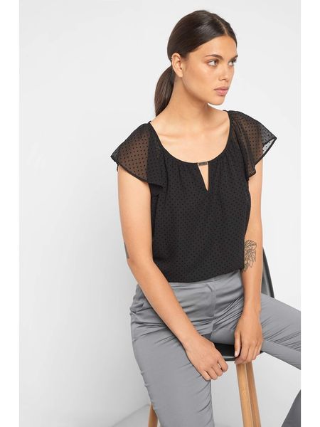– dekolt: okrągły- krój rękawów: motylek- krój: prosty- wzór: kropki