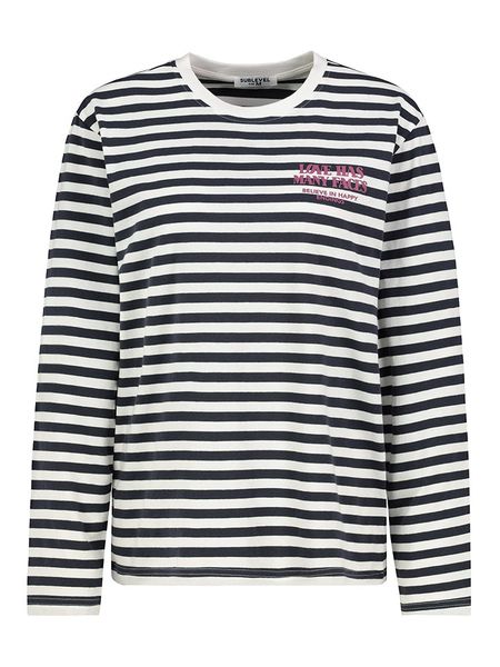 – czysta bawełna- dekolt: okrągły- krój: luźny- nadruk: w formie napisu- wzór: paski