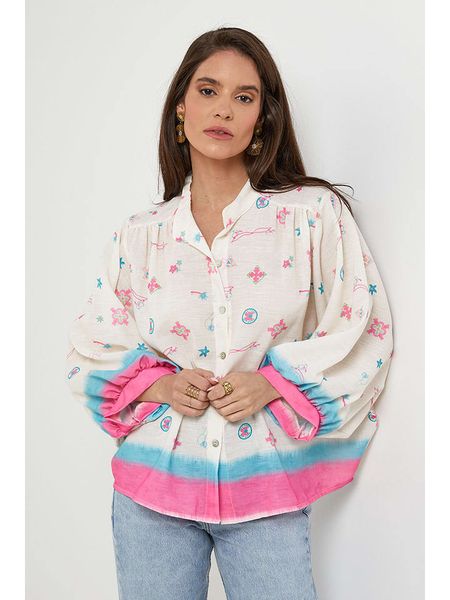 – czysty len- dekolt: z rozcięciem- zapięcie: listwa guzikowa- rękaw: bufiasty- długość rękawa: 7/8- krój: oversized- wzór: mix
