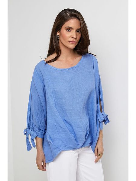 – czysty len- dekolt: okrągły- zakończenie rękawów: supełek- długość rękawa: 3/4- krój: oversized- look: jednokolorowy