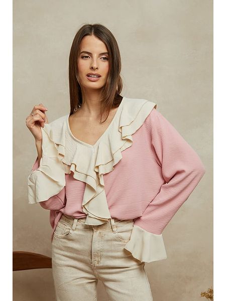 – dekolt: V- krój rękawów: rozszerzany do dołu- detale: falbany- krój: luźny- look: jednokolorowy