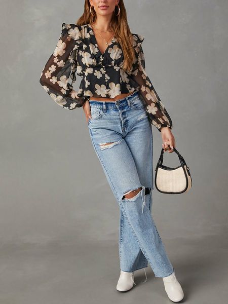 – dekolt: V- zapięcie: listwa guzikowa- krój rękawów: motylek- długość rękawa: długi- zakończenie rękawów: elastyczne- krój: rozkloszowany- wykończenie: delikatnie prześwitujące- wzór: kwiatowyUwaga: Przy wyborze właściwego wariantu zaleca się korzystanie z tabeli rozmiarów.