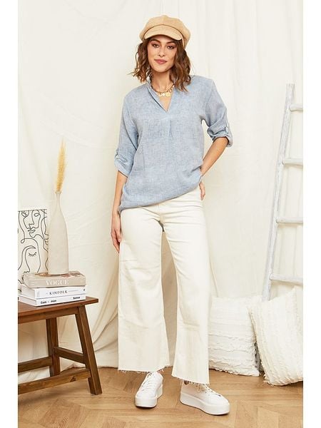 – czysty len- dekolt: V- zakończenie rękawów: patka i guzik- krój: luźny- look: jednokolorowy