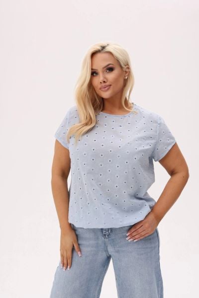 Jasnoniebieska bluzka Lira ze 100% haftowanej bawełny w drobne stokrotki PLUS SIZE XXL OVERSIZE JESIEŃ