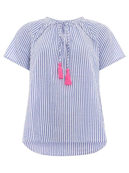 – czysta wiskoza- dekolt: okrągły- detale: ozdobne wiązanie- krój: dłuższe plecy- wzór: paski