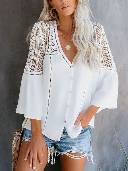 – dekolt: V- zapięcie: listwa guzikowa- rękaw: bufiasty- długość rękawa: 7/8- krój: prosty- dolny brzeg: zaokrąglony- detale: szydełkowana koronka- look: jednokolorowyUwaga: Przy wyborze właściwego wariantu zaleca się korzystanie z tabeli rozmiarów.