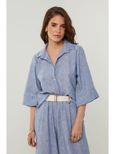 – czysty len- kołnierz: kent- zapięcie: listwa guzikowa- długość rękawa: 3/4- detale: ozdobna zakładka- krój: luźny- wzór: melanżowy