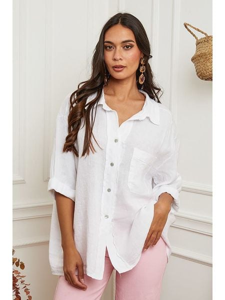 – czysty len- kołnierz: kent- zapięcie: listwa guzikowa- kieszenie: na piersi- krój: luźny- look: jednokolorowy
