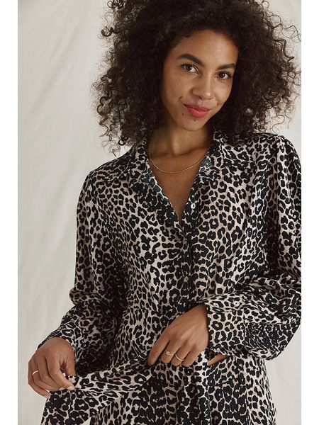 – kołnierz: kent- zapięcie: skrócona listwa guzikowa, wiązane tasiemki- krój: prosty- wzór: panterka