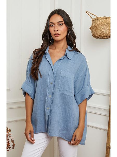 – czysty len- kołnierz: kent- zapięcie: listwa guzikowa- kieszenie: na piersi- krój: luźny- look: jednokolorowy