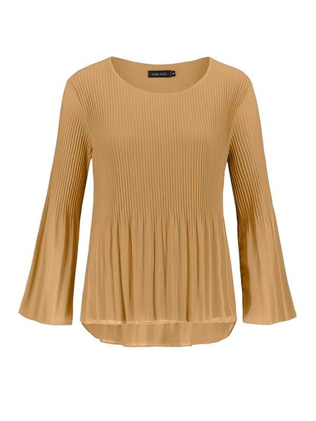 – dekolt: okrągły- krój rękawów: rozszerzany do dołu- detale: plisy- krój: prosty- look: jednokolorowy