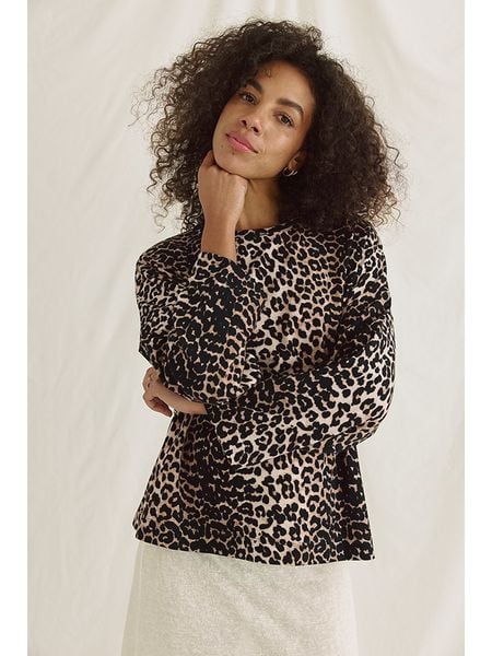 – dekolt: okrągły- krój rękawów: rozszerzany do dołu- detale: nakładane rękawki- krój: oversized- wzór: panterka