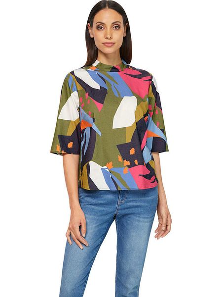 – zapięcie: guzik na plecach- kołnierz: stójka- długość rękawa: 3/4- krój: luźny- wzór: graficzny