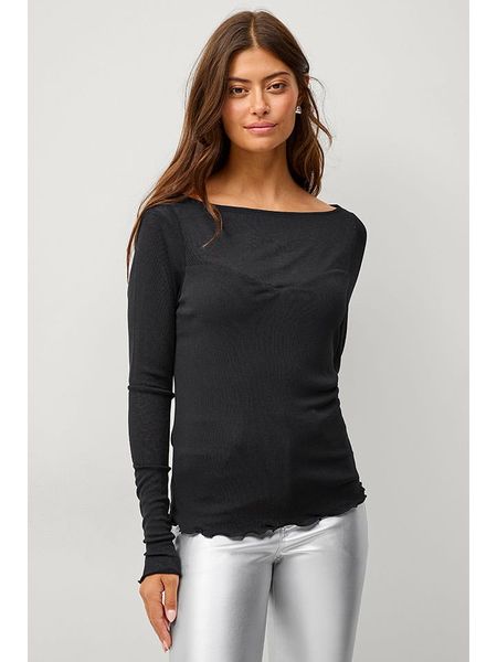 – dekolt: łódka- wykończenie: delikatnie prześwitujące- zrolowany brzeg: zakończenia rękawów- krój: wąski- look: jednokolorowy