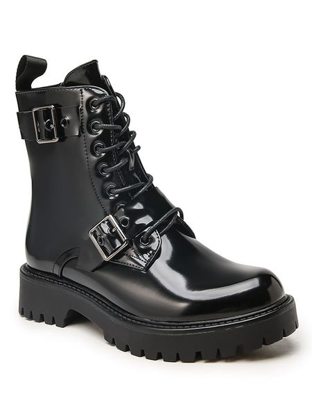 – zapięcie: sznurowanie z bocznym suwakiem- noski: zaokrąglone- noski i zapiętki: wzmocnione- detale: ozdobna klamra- forma obcasa: blokowy- podeszwa: profilowana