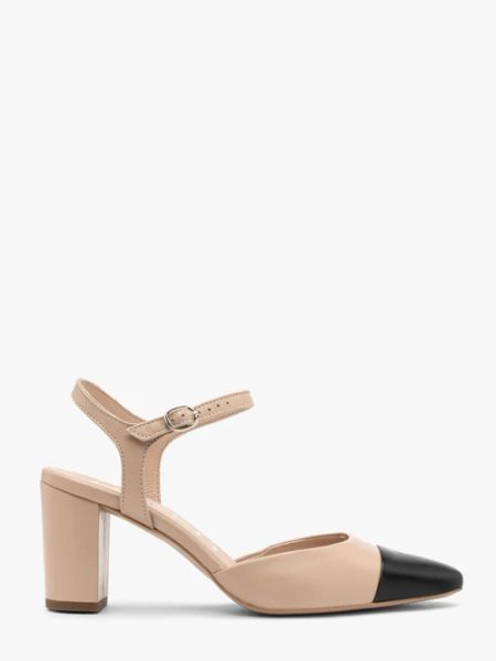 Beżowe czółenka z czarnym noskiem na obcasie typu słupek z linii RYŁKO.Model wykonany ze skóry licowej.Podszewka i wyściółka skórzana.Obcas oblekany o wysokości 7,5 cm.Wysokość obcasa uśredniona dla rozmiaru 37.Nosek okrągły.R. SILENCE – wyciszenie obcasa, uzyskane dzięki zastosowaniu nowego technologicznie fleka, tłumiącego drgania podczas chodzenia.