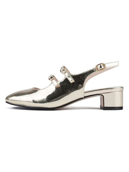 – zapięcie: sprzączka- noski: zaokrąglone- powierzchnia: z metalicznym połyskiem- skórzana wkładka: tak- forma obcasa: blokowy- podeszwa: antypoślizgowa