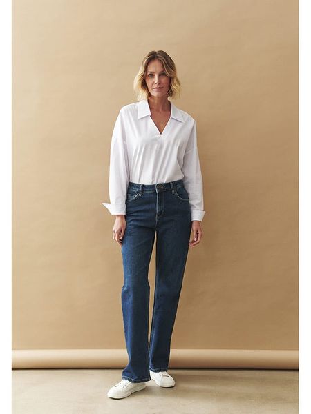 – wysokość pasa: high waist- fason: regular fit- krój nogawek: prosty- szlufki na pasek: tak- zapięcie: guzik i suwak- kieszenie: 5 klasycznych- naszywki: ze skóry syntetycznej- przetarcia: tak