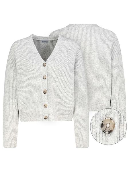 – dekolt: V- zapięcie: listwa guzikowa- wzór splotu: luźny- krój: prosty- look: jednokolorowy