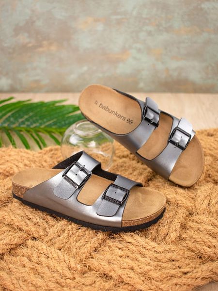 – zapięcie: sprzączka- otwarte noski- wkładka: formowana ergonomicznie- powierzchnia: z metalicznym połyskiem- lekko profilowana podeszwa