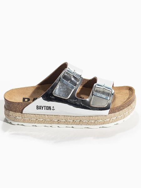 – zapięcie: sprzączka- powierzchnia: z metalicznym połyskiem- noski: otwarte- skórzana wkładka: ergonomicznie formowana- detale: splot jutowy- podeszwa: profilowana