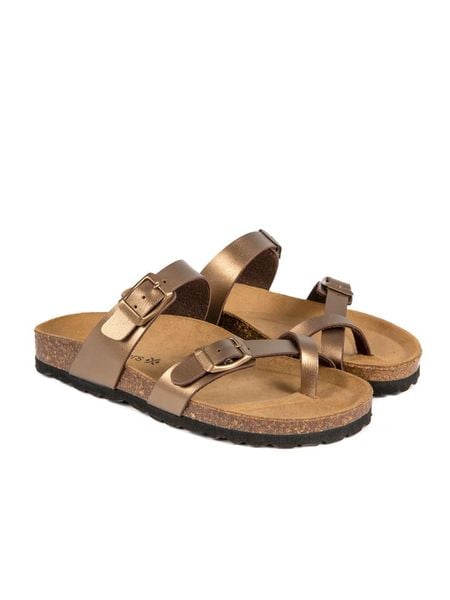 – zapięcie: sprzączka- otwarte noski- pasek: skóra- wkładka: formowana ergonomicznie- powierzchnia: metalicznie błyszcząca- lekko profilowana podeszwa