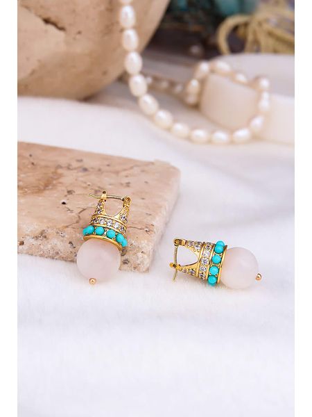 – materiał: mosiądz- powłoka: złoto- zapięcie: wtyk- rodzaj kamienia 1: cyrkonia- rodzaj kamienia 2: różowy kwarc- rodzaj kamienia 3: turkusWskazówka: Zdjęcie produktu w powiększeniu.