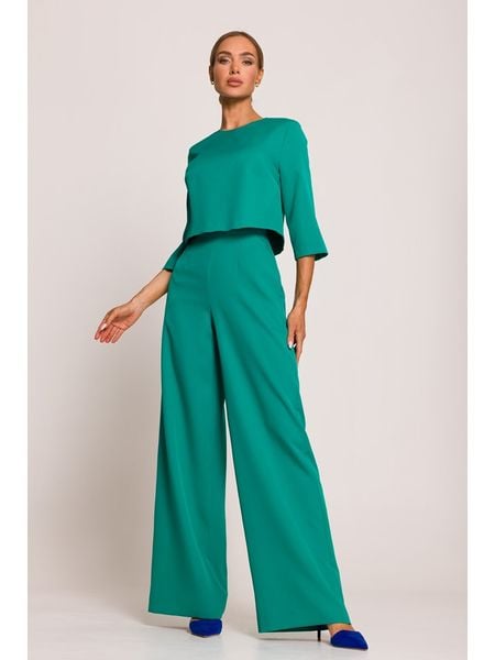 – dekolt: okrągły- zapięcie: suwak z tyłu- długość rękawa: półdługi- kieszenie: wpuszczane- zakończenia nogawek: dzwony- krój: prosty- look: jednokolorowy