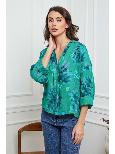 – czysty len- kołnierz: kent- dekolt: V- zapięcie: listwa guzikowa- krój: prosty- wzór: kwiatowy