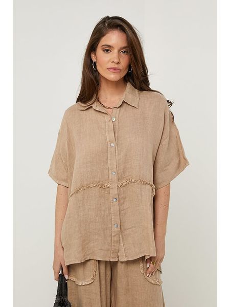 – czysty len- kołnierz: kent- zapięcie: listwa guzikowa- długość rękawa: półdługi- dolny brzeg: zaokrąglony- detale: frędzle- krój: oversized- look: jednokolorowy