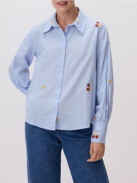 Koszula o prostym kroju, wykonana z bawełnianej tkaniny z domieszką lnu.