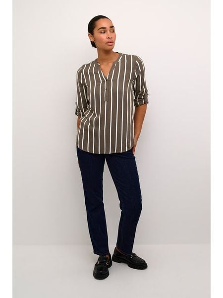 – dekolt: z rozcięciem- zapięcie: skrócona listwa guzikowa- zakończenie rękawów: patka i guzik- krój: luźny- wzór: paski