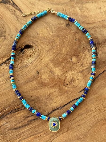 – materiał: mosiądz- powłoka: 18K złoto- typ łańcuszka: ankier- zapięcie: karabińczyk- rodzaj kamienia 1: amazonit- rodzaj kamienia 2: lapis lazuli- kolor kamieni: turkusowy, granatowy- element ozdobny: medalion- regulacja długości: takWskazówka: Zdjęcie produktu w powiększeniu.