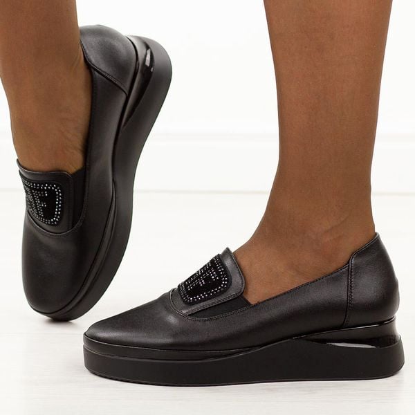 Czarne skórzane półbuty damskieto eleganckie i wygodne obuwie stworzone na wiosnę oraz jesień. Cholewka wykonana została z wysokiej jakości skóry naturalnej, co zapewnia trwałość i komfort noszenia. Model posiada dwie praktyczne rozciągliwe gumy, które ułatwiają zakładanie butów, a dodatkowym atutem jest ozdoba wysadzana błyszczącymi cyrkoniami, nadająca całości wyjątkowego charakteru. Buty są wsuwane, mają klasyczny okrągły nosek […]