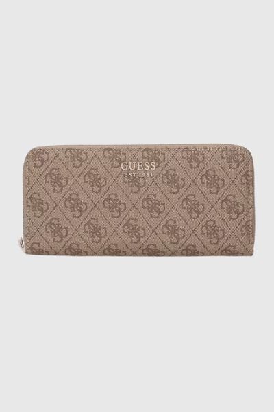 Beżowy damski portfel ze skóry ekologicznej marki Guess. Zamykany na zamek, wewnątrz zasuwana kieszeń na bilon, dwie przegrody, 12 miejsc na karty, dwie wsuwane kieszenie i dodatkowa kieszeń na zamek z tyłu.