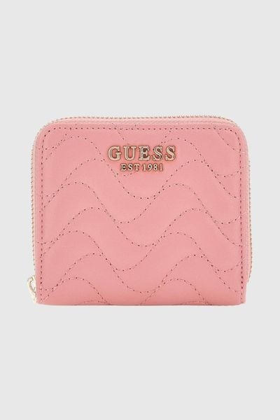 Różowy damski portfel ze skóry ekologicznej marki Guess. Zamykany na zamek, wewnątrz zamykana kieszeń na bilon, jedna przegroda i 4 miejsca na karty.