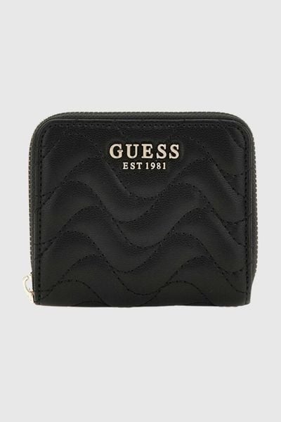 Czarny damski portfel ze skóry ekologicznej marki Guess. Zamykany na zamek, wewnątrz zamykana kieszeń na bilon, jedna przegroda, 4 miejsca na karty.