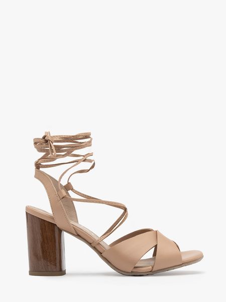 Beżowe sandały na słupku z wiązaniem wokół kostki
