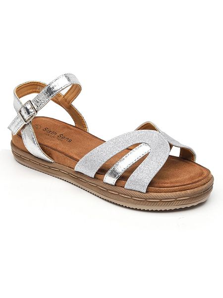 – zapięcie: sprzączka- noski: otwarte- powierzchnia: z metalicznym połyskiem – detale: połyskujące elementy- podeszwa: antypoślizgowa
