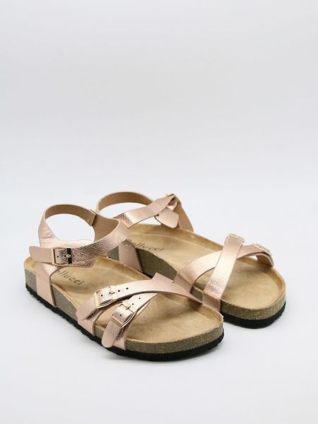 – zapięcie: sprzączka- noski: otwarte- powierzchnia: z metalicznym połyskiem- wkładka: ergonomicznie formowana- podeszwa: antypoślizgowa