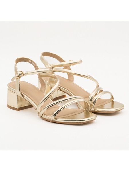– zapięcie: sprzączka- noski: otwarte- powierzchnia: z metalicznym połyskiem- forma obcasa: blokowy- podeszwa: antypoślizgowa