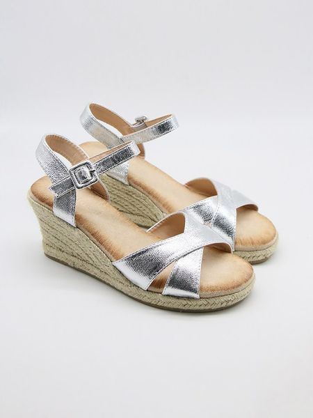 – zapięcie: sprzączka- noski: otwarte- powierzchnia: z metalicznym połyskiem- forma obcasa: koturny- podeszwa: antypoślizgowa